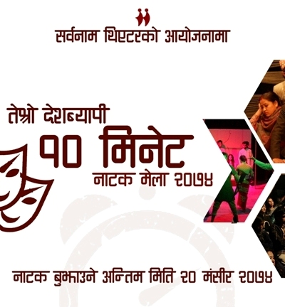 सर्वनाम थिएटरको आयोजना राजधानीका तेस्रो देशव्यापी दश मिनेट नाटक मेला शुरु भएको छ। शुक्रबार राज शाह निर्देशित राजेन्द्र सलभको कवितामाथि बनाइएको नाटक कलम र बन्दुकबाट शुरू भएको नँटक मेलामा माधवप्रसाद बन्जोरको लेखक को ?, प्रियंका झा निर्देशित मैथिली नाटक कथानह भेटल मञ्चन भएको छ।