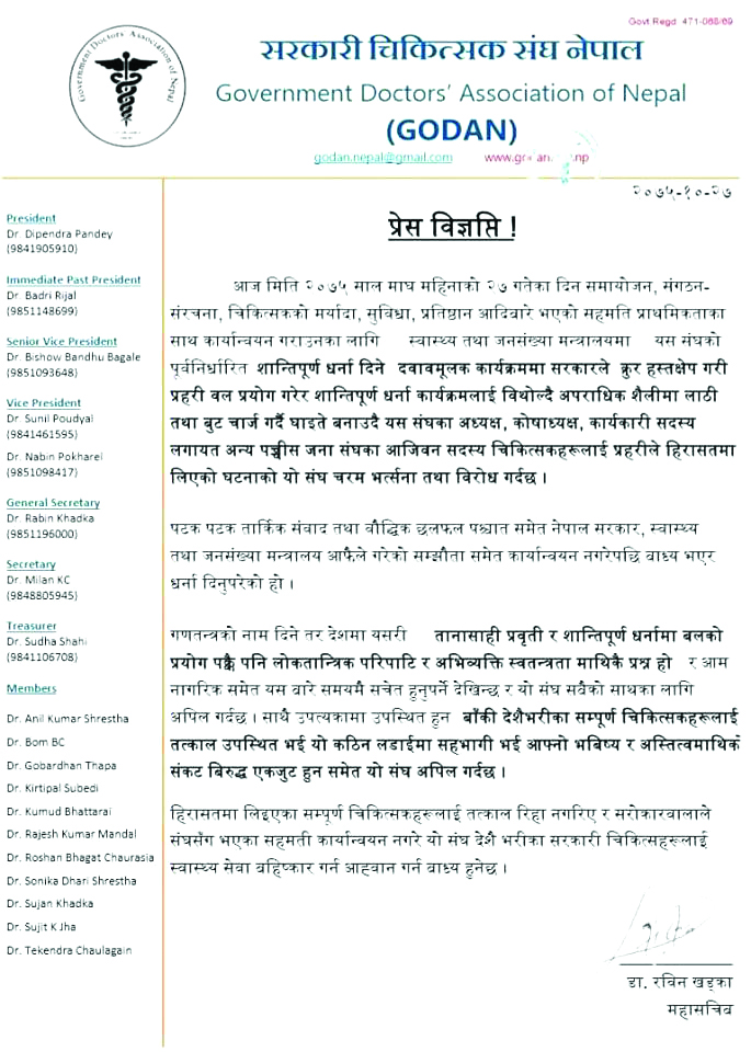 नेपाल सरकारले चिकित्सकको समायोजनका सम्बन्धमा गरेको विवादास्पद निर्णयका विरुद्ध स्वास्थ्य तथा जनसंख्या मन्त्रालयमा शान्तिपूर्वक धर्ना दिइरहेका सरकारी चिकित्सकमाथि मन्त्रालयको प्रांगणभित्रै प्रहरीले हातपात गर्दै गिरफ्तार गरेको भन्दै नेपाल चिकित्सक संघले गिरफ्तार गरिएका सम्पूर्ण चिकित्सकलाई बिनासर्त तुरुन्त रिहा गर्न माग गरेको छ।
