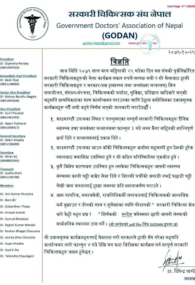 पटक–पटक तार्किक संवाद तथा बौद्धिक छलफलपश्चात् समेत नेपाल सरकार, स्वास्थ्य तथा जनसंख्या मन्त्रालय आफंैले गरेको सम्झौता समेत कार्यान्वयन नगरेपछि बाध्य भएर धर्ना दिनुपरेको संघको धारणा छ।