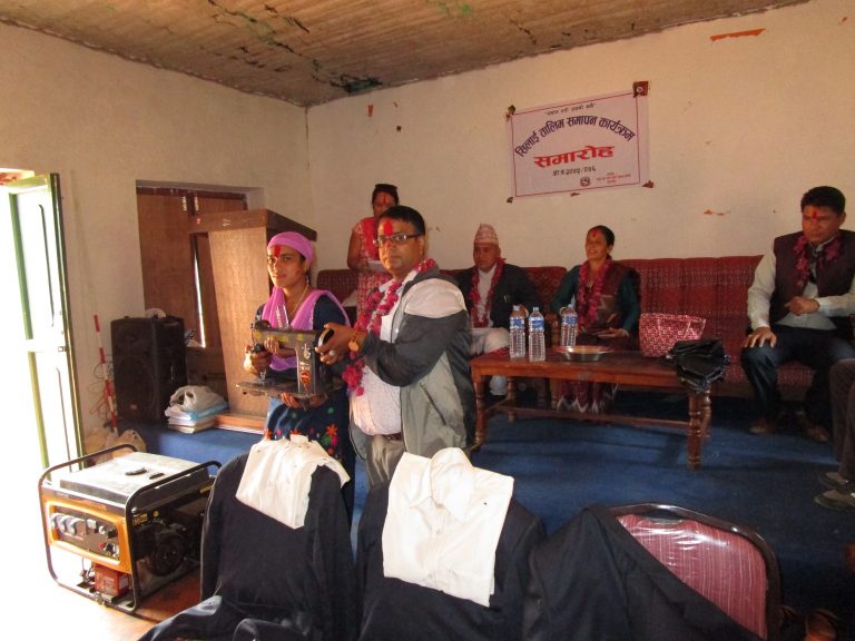 घरेलु विकास समितिले प्रशिक्षार्थिहरुलाई सिलाईमा चाहिने सामाग्री मेशिन पाँच जना प्रशिक्षार्थीहरुलाई कार्यालय प्रमुख चेत नाथ घिमिरेले समापन कार्यक्रममा हस्तान्तरण गर्नु भएको थियो ।