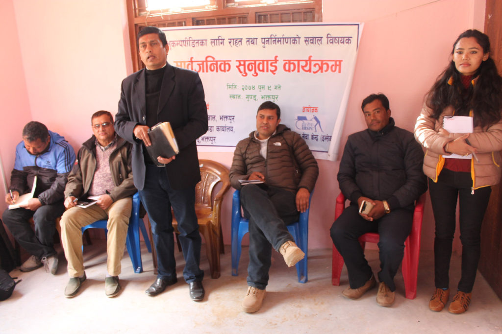 पुष्कर बुढाथोकी, भक्तपुर । सूर्यविनायक नगरपालिकाका बासिन्दाले राष्ट्रिय भूकम्प पुर्ननिर्माण प्राधिकरण भक्तपुरका प्रमुख र ईन्जिनियरलाई अनुदान सम्झौता भएपनि अनुदान नपाएको गुनासो गरेका छन् । सूर्यविनायक नगरपालिका ७ गुण्डुमा अनौपचारिक क्षेत्र सेवा केन्द्र (ईन्सेक)को आयोजना तथा मानव अधिकार सञ्जाल भक्तपुर र गुण्डु वडा नं. ७ कार्यालयको सहकार्यमा सम्पन्न भूकम्प पीडितका लागि राहत तथा पुर्ननिर्माणको सवाल विषयक सार्वजनिक सुनुवाई कार्यक्रममा सहभागि भूकम्प पीडितले अनुदान नपाएको गुनासो राखेका थिए ।