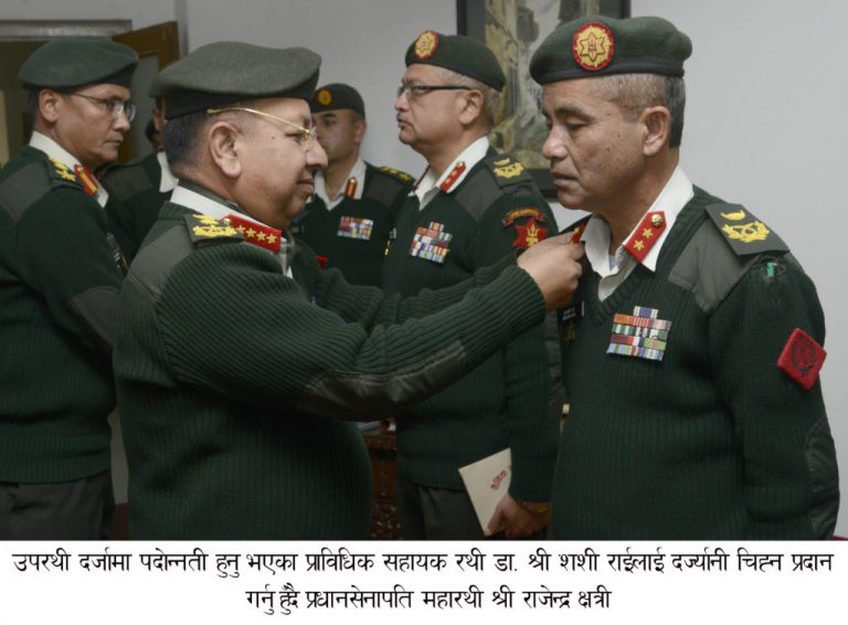 गत पुष १३ गतेको भएको मन्त्रिपरिषद्कोे निर्णय अनुसार उपरथी दर्जामा पदोन्नती भएका सैनिक स्वास्थ्य महानिर्देशनालयका प्राविधिक सहायक रथी डा. शशी राई र झंकरबहादुर कडायतलाई बुधबार जङ्गी अड्डामा आयोजित एक बिशेष समारोहमा प्रधानसेनापति राजेन्द्र क्षत्रीले उपरथी दर्जाको दज्र्यानी चिह्न प्रदान गरेका छन् ।