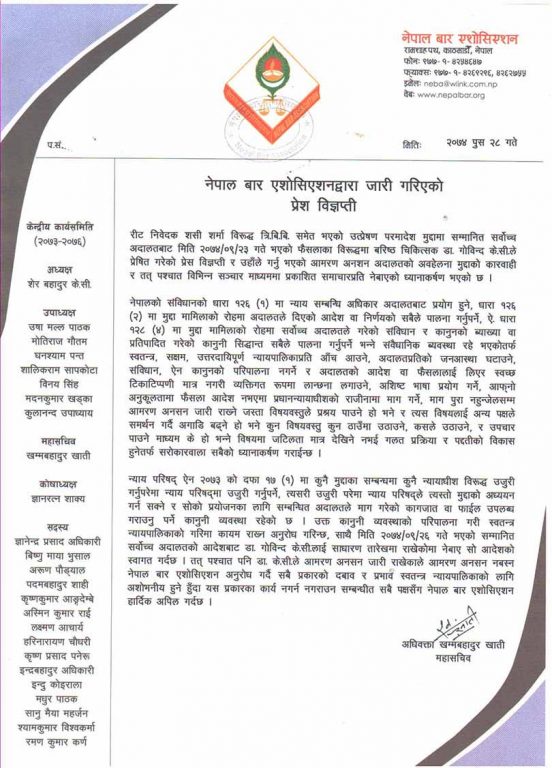 प्रशान्त वली, काठमाडौं । नेपाल वार एशोसियशनले प्रा. डा. गोविन्द केसीले प्रकृया मिचेर प्रधानन्यायाधिसलाई लान्छना लगाएको आरोप लगाएको छ । शुक्रबार वार एशोसियशनले विज्ञप्ती जारी गरी न्यायाधिस बिरुद्ध उजुरी गर्नुपरेमा न्याय परीषद् हुँदा हुँदै अदालतको आदेश र फैसलालाइ लिएर अशिष्ट भाषाको प्रयोग गरेको बताएको छ ।