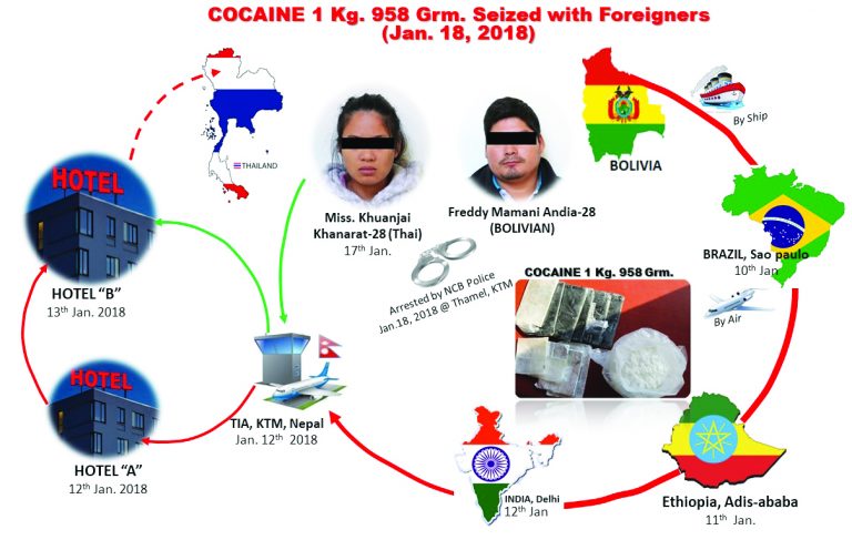 लागूऔषध नियन्त्रण ब्युरोका अनुसार फ्रेडी ममनी एन्डिया, थाई महिला खुइनजाई खनरतलाई १ किलो ९ सय ५८ ग्राम कोकिनसहित काठमाडौंको एक होटलबाट पक्राउ गरेको हो। दुवै जना बोलेभियाबाट ब्राजिल, अफ्रिकी मुलुक इथोपियाबाट भारत हुँदै नेपाल आएका थिए। उनीहरूलाई एकआपसमा कोकिन लेनदेन गर्न लागेको अवस्थामा काठमाडौं ठमेलस्थित एक होटलबाट पक्राउ गरिएको ब्युरोले जनाएको छ।