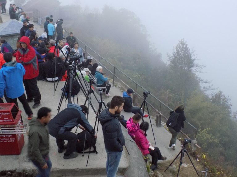 निकै उत्साह र उमङ्गका साथ बिहान भुइँमा उज्यालो नझर्दै बाह्य र आन्तरिक पर्यटक सराङकोटको उकालो चढिरहेका थिए। आसपासका चिया नास्ताका पसल पनि धमाधम खुल्दै थिए। हात र काँधमा क्यामराको भारी बोकेर उकालो चढेका पर्यटकमा निकै उत्साह देखिन्थ्यो तर यो उत्साह लामो समय टिक्न सकेन जब चारैतिर तुवाँलोले ढाकेर सूर्योदयसम्म छेकिदियो। वरिपरिका हिमशृंखला, डाँडापाखा, तालतलैया सबै छेकिए, पर्यटकहरूको मन र उत्साह पनि निराशाले छेकिदियो।