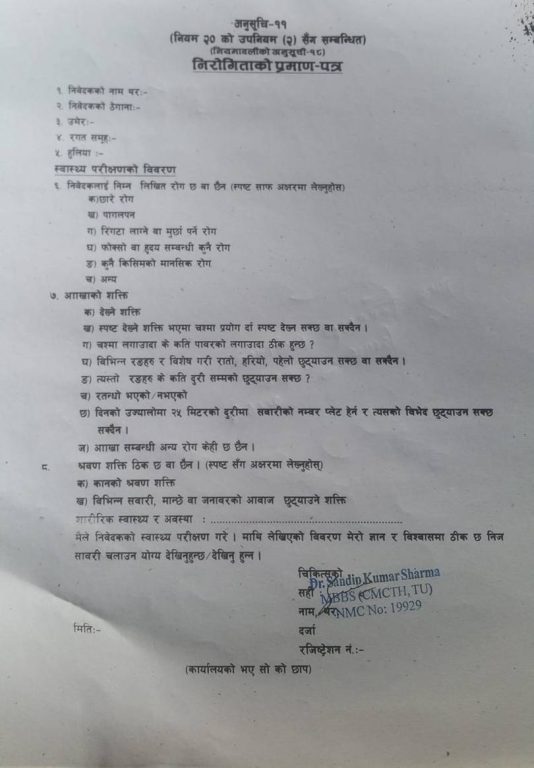 सवारी चालक अनुमतिपत्रका लागि आवेदन फाराम भर्दा अनुसूची ११ को नियम २० को उपनियम २ संग सम्बन्धित नियमावलीको अनुसूची १८ बमोजिम निरोगिताको प्रमाणपत्र अनिवार्य रूपमा पेश गर्नुपर्ने हुन्छ। धवलागिरी अञ्चल यातायात व्यवस्था कार्यालयको अगाडिका स्टेसनरी पसलहरूमा डा.सन्दीप कुमार शर्मा नेपाल मेडिकल काउन्सिल दर्ता नम्बर १९९२९ भएको छाप हानेर धमाधम फर्जी निरोगिताको प्रमाणपत्र बिक्री गरिरहेका छन्।