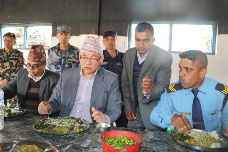 गृहमन्त्रीको स्वकिय सचिवालयका सदस्य र प्रहरी वृत्तका प्रमुख अपिल बोहराले पनि साथै खाना खाए । दाल, भात, आलु र गोभीको तरकारी, साग र आलुका अचार खानमा पाकेको थियो । गृहमन्त्री आउने जानकार नभएरै खानामा मासु पाकेको थियो ।