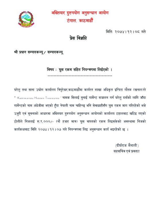 काठमाडौँ हिड्न ट्रेजर नामको सिलाई बुनाइ गार्मेन्टको नाम नेपालीमा लेख्नका लागि घुस माग्दा उनी पक्राउ परेको अख्तियार दुरुपयोग अनुसन्धान आयोगले जनाएको छ ।