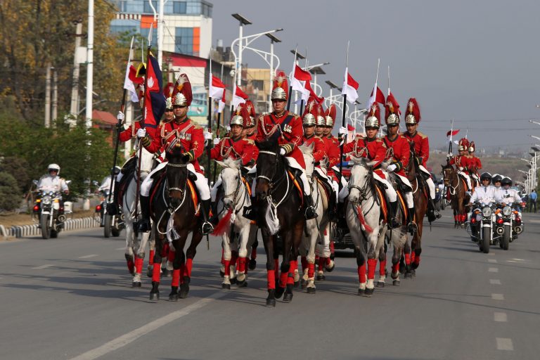 राष्ट्रपति विद्यादेवी भण्डारी संघीय संसद भवन नयाँ बानेश्वरमा प्रतिनिधिसभा र राष्ट्रिय सभाको संयुक्त बैठकलाई सम्बोधन गर्न पुग्नु हुँदा नेपाली सेनाले अर्पण गरेको सलामी ग्रहण गर्नुहुँदै । साथमा उपराष्ट्रपति नन्दबहादुर पुन, प्रधानमन्त्री केपी शर्मा ओली, सभामुख कृष्णबहादुर महरालगायत । तस्बिरः रत्न श्रेष्ठ, रासस