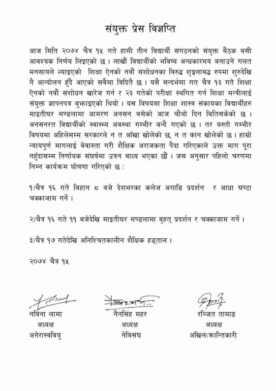 अनेरास्ववियु, अखिल क्रान्तिकारी र नेबिसंघले यही चैत १७ गतेदेखि अनिश्चितकालसम्म शैक्षिक हड्ताल घोषणा गरेका हुन् । अहिले केहीबेरमा काठमाडौँको माइतीघर मण्डलामा बृहत प्रदर्शनको तयारी गरेको अनेरास्ववियुका उपाध्यक्ष महेश बर्तौलाले बताएका छन ।