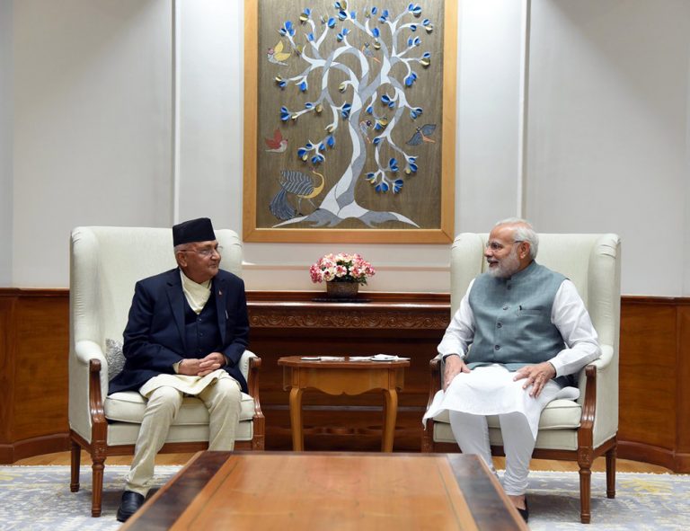 काठमाडौं । भारत भ्रमणमा रहेका प्रधानमन्त्री केपी शर्मा ओलीले भारतीय समकक्षी नरेन्द्र मोदीसँग भेट गरेका छन् । नयाँदिल्लीस्थित हैदरावाद हाउसमा दुई प्रधानमन्त्रीबीच एक्लाएक्लै भेटवार्ता सुरू भएको हो ।
