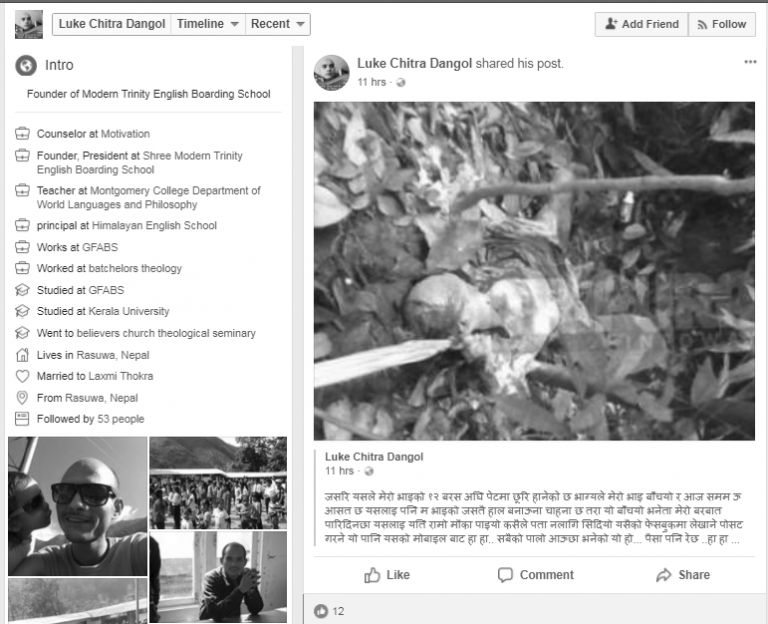 काठमाडौँ । रसुवाको उत्तरगया गाउँपालिकामा रहेको मोर्डन ट्रिनिटी इङ्लिस बोर्डिङ स्कुलका सञ्चालक मारिएको भन्ने स्टाटस उनकै फेसबुकमा पोस्ट भएको छ ।