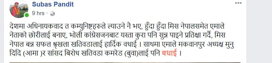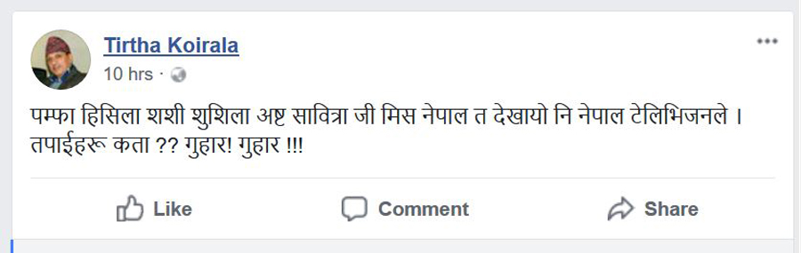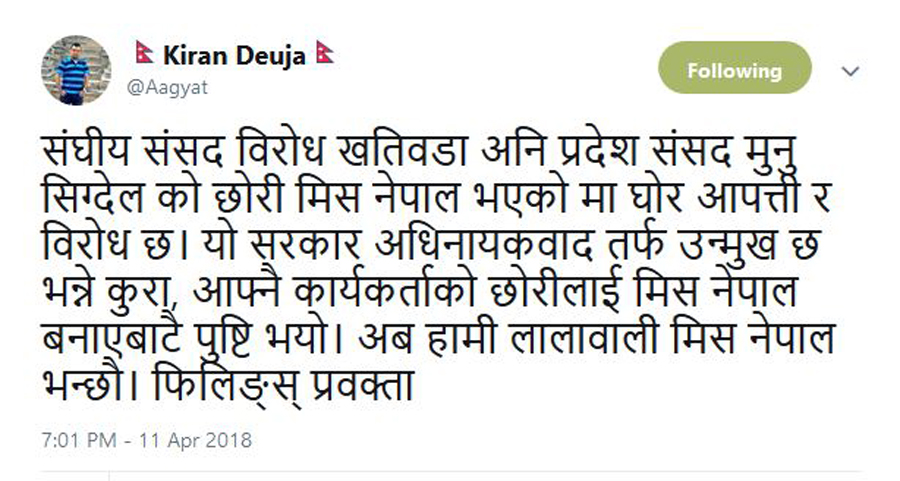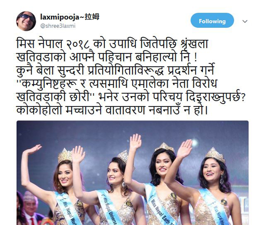 केही वर्षअघिसम्म मिस नेपाल सौन्दर्य प्रतियोगिताको कम्युनिस्टहरु निकै बिरोध जनाउने गर्थे। विरोध प्रदर्शनका कारण मिस नेपाल आयोजना स्थलबाहिरको सुरक्षाब्यवस्था कडा बनाउनु पर्ने अवस्था समेत सिर्जना हुने गरेको थियो । कम्युनिस्ट पार्टी निकट महिला संगठनहरूले यस्ता प्रतियोगिताको बिरोधमा चर्को आवाज उठाउने गरेका थिए ।