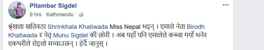 काठमाडौँ । श्रृङ्खला खतिवडा यस वर्षको ‘मिस नेपाल २०१८’ बनेकी छन् । अन्तिम प्रतिस्पर्धामा उनले २४ जनालाई उछिन्दै मिस नेपालको ताज भिरेकी हुन् । श्रङ्खलालाई मिस नेपाल २०१७ की विजेता निकिता चण्डकले क्राउन पहिर्याएकी थिइन् ।