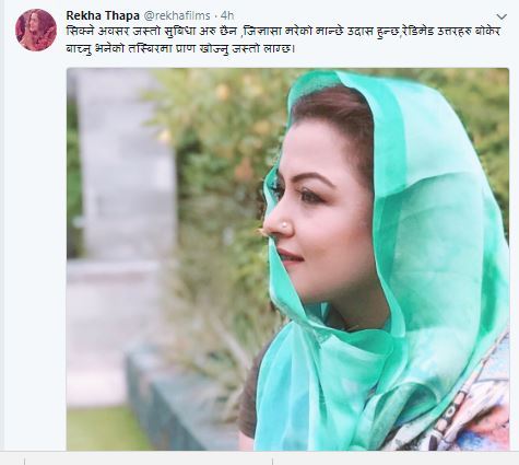 काठमाडौं । नेपाली चलचित्रकी चर्चित नायिका रेखा थापाले सिक्ने अवसर जस्तो सुविधा कुनै नभएको बताएकी छन् । मंगलबार ट्विट गर्दै नायिका थापाले यस्तो बताएकी हुन् ।