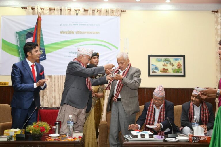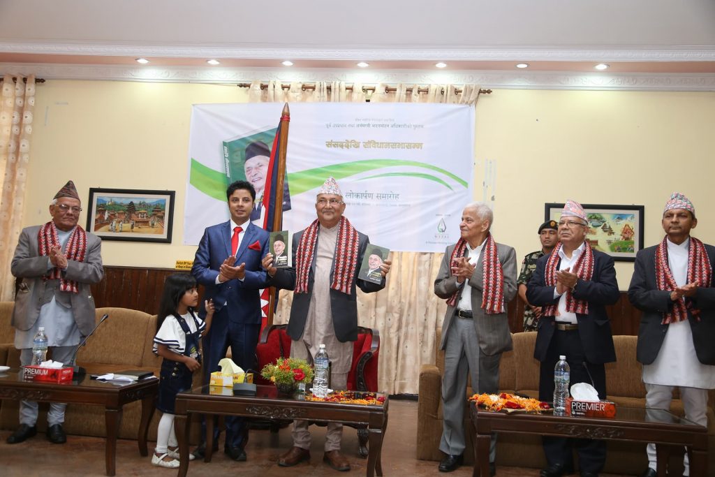 काठमाडौं । प्रधानमन्त्री केपी शर्मा ओलीले नेकपा (एमाले)का नेताएवं पूर्व उपप्रधानमन्त्री भरतमोहन अधिकारीद्वारा लिखित पुस्तक संसद देखि संविधानसभासम्म बिमोचन गर्नुभएको छ ।