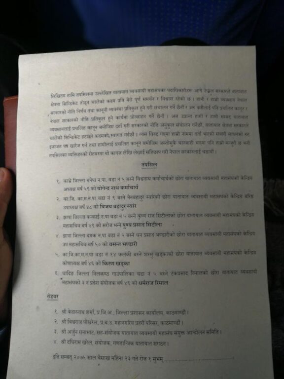 समितिहरु खारेज गर्ने तथा देशभर रुट परमिट खुला गरेको विरोधमा व्यवसायीहरु आन्दोलनमा उत्रेका थिए। २७ गतेदेखि गाडी अनिश्चितकालीन रुपमा थन्क्याउने योजनामा रहेका व्यवसायी विरुद्ध सरकार आक्रामक बनेपछि उनीहरु निरीह बनेका हुन्। छलफलपछि उनीहरु सबै आन्दोलन फिर्ता लिई सरकारले थालेको सिन्डिकेट विरुद्ध अभियानमा साथ दिन तयार भएको काठमाडौं परिसरका डिएसपी मोहन थापाले बताए।
