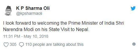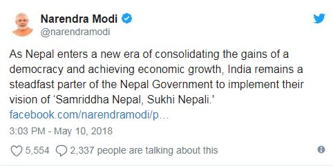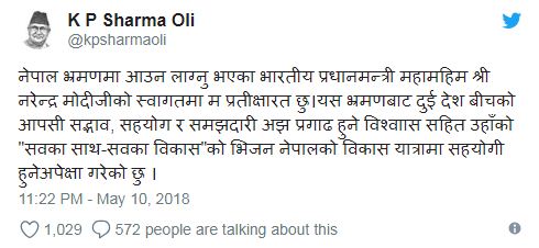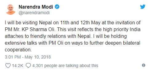 प्रधानमन्त्री केपी शर्मा ओलीको निमन्त्रणामा म वैशाख २८ र २९ गते नेपाल भ्रमण गर्दै छु । यो भ्रमणले भारतको नेपालसँग मित्रवत सम्बन्धलाई दिँदै आएको उच्चतम प्राथमिकता प्रतिविम्बित गर्दछ । द्विपक्षीय साझेदारी थप मजबुत बनाउने दिशामा प्रधानमन्त्री ओलीसँग म विस्तृत छलफल गर्नेछु ।