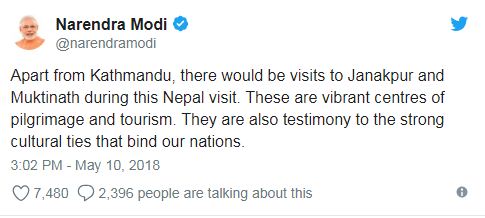 भ्रमणमा म काठमाण्डुबाहेक जनकपुर र मुक्तिनाथ जानेछु । यी तीर्थयात्रा र पर्यटनका दुई गतिशील केन्द्र हुन् । दुई देशलाई बलियो सांस्कृतिक सम्बन्धमा बाँध्ने प्रतीक पनि हुन् ।