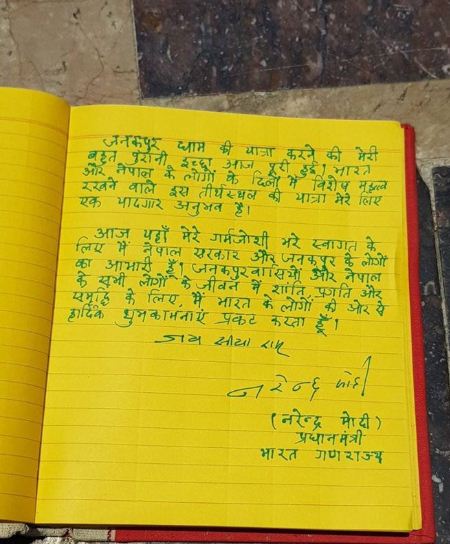 आज जनकपुरस्थित जानकी मन्दिरमा पूजापछि मोदीले आगन्तुक पुस्तिकामा लेखेका छन्, ‘जनकपुर धामकी यात्रा करनेकी मेरी बहुत पुरानी इच्छा आज पुरी हुई । भारत और नेपालके लोगो के दिलो मे विशेष महत्व राख्नेवाले इस तीर्थस्थल की यात्रा मेरे लिए एक यादगार अनुभव है ।’ पुस्तिकामार्फत उनले नेपालको समृद्धिका लागि शुभकामनासमेत दिएका छन् ।