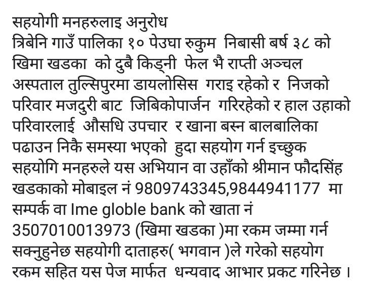 दुवै मृगौला फेल भएर राप्ती अञ्चल अस्पताल तुल्सीपुरमा डायलोसिस गराईराखेकोले सहयोगको लागी परिवारले सबैसँग अनुरोध गरेको छ । खिमाका श्रीमान फौंदसिह खड्काले आफ्नी श्रीमतीको ज्यान बचाई दिन सहयोगका लागी सबैसँग आग्रह गरेका छन् ।