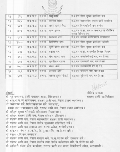 काठमाडौं । सशस्त्र प्रहरीका २३ जना प्रहरी नायव उपरीक्षक (डीएसपी)लाई प्रहरी उपरीक्षक (एसपी)मा बढुवा गरिएको छ । विहीबार गृहमन्त्रालयको सचिवस्तरको बैठकले २३ जना डीएसपीलाई एसपीमा बढुवा गर्ने निर्णय गरेको हो ।