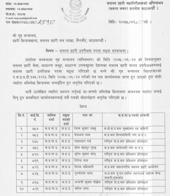 काठमाडौं । सशस्त्र प्रहरीका २३ जना प्रहरी नायव उपरीक्षक (डीएसपी)लाई प्रहरी उपरीक्षक (एसपी)मा बढुवा गरिएको छ । विहीबार गृहमन्त्रालयको सचिवस्तरको बैठकले २३ जना डीएसपीलाई एसपीमा बढुवा गर्ने निर्णय गरेको हो ।