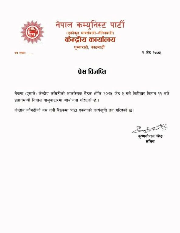 काठमाडाैँ । नेकपा (एमाले)ले केन्द्रीय कमिटीको आकस्मिक बैठक बेलाएको छ । एमालेले भोलि जेठ ३ गते बिहीबार बिहान ११ बजे प्रधानमन्त्री निवास बालुवाटारमा बस्ने गरी बैठक बोलाएको हो ।