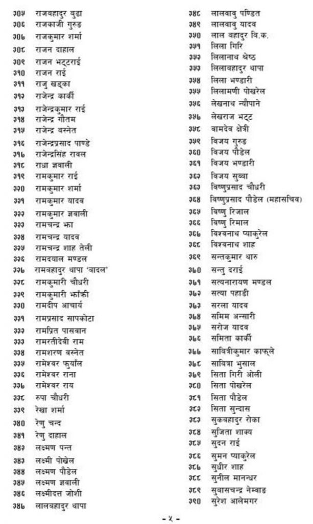 काठमाडौं । नव गठित नेपाल कम्युनिष्ट पार्टीको केन्द्रीय सदस्यहरुको अन्तिम सूचि आज सार्वजनिक गरिएको छ । सो पार्टीका महासचिव विष्णु पौडेलले आज सार्वजनिक गरेको सूचिमा कूल ४४१ जना केन्द्रीय सदस्य तथा ६ जना आमन्त्रित सदस्यको रुपमा समावेश छ ।