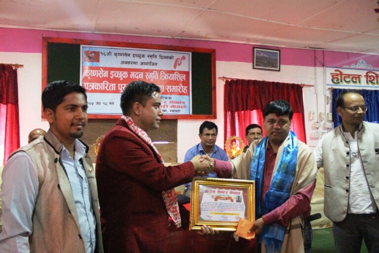 यसैबीच प्रेस सेन्टर म्याग्दीद्वारा स्थापित कृष्णसेन मदन स्मृति क्रियाशील पत्रकारिता पुरस्कारबाट म्याग्दीका पत्रकार ठाकुरप्रसाद आचार्य सम्मानित भएका छन् । १६औं कृष्णसेन स्मृति दिवसको अवसर पारेर आइतबार प्रेस सेन्टर र प्रेस चौतारी म्याग्दी शाखाले बेनीमा आयोजना गरेको कार्यक्रममा आचार्यलाई नगद पाँचहजार रुपैयाँसहित सम्मानपत्र र दोसल्ला ओढाएर सम्मान गरिएको हो ।