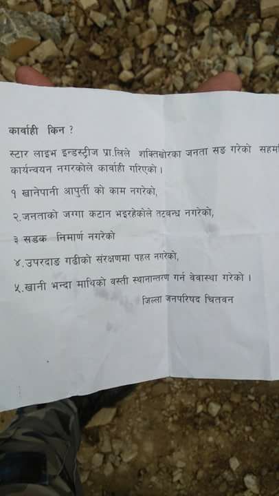 जिल्ला जनपरिषद् चितवनको नाममा छोडिएको पर्चामा स्थानियसंगको सहमती अनुसार काम नगरेको,सडक निर्माण,खानेपानी र बस्ति स्थानान्तरण लगाएतका काम नगरेको भन्दै कार्बाही गरिएको उल्लेख गरिएको छ । घटनामा संलग्न रहेका व्यक्तिको खोजी भैरहेको प्रहरी प्रमुख राठौरले बताउनुभयो ।