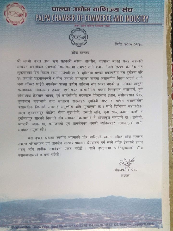 पाल्पा उद्योग वाणिज्य संघका अध्यक्ष मोहनप्रसाद श्रेष्ठले एक विज्ञप्ति जारी गरी संघका कानूनी सल्लाहकार लोकप्रसाद ढकाल,एशोसियट कार्य समिती सदस्य विष्णुमान वज्राचार्य,पूर्व कोषाध्यक्ष क्षेत्रमान शाक्य, पूर्व कार्यसमिती सदस्य देवेन्द्रलाल प्रधान,शुशील प्रसाद श्रेष्ठ,कृष्णमान वज्राचार्य तथा साधारण सदस्यहरु दुर्गादेवी श्रेष्ठ र सचिन वजा्रचार्यको साथै डिभिजन सहकारीका प्रमुख कृष्ण वहादुर वोहोरा,गीता वुढाथोकी,वसन्ती खाँड, मुना सारु, कमला कार्की र दुर्गा वहादुर सारुको निधनले संघ लगायत जिल्लालाई नै शाकाकूल वनाएको उल्लेख गर्दै उद्योगी, व्यापारी व्यवसायी समाजसेवी एवम् तानसेनका अग्रणी व्यतिmत्व गुमाउनुपर्दा मर्माहत भएको उल्लेख गर्दै स्वर्गीय आत्माको चीर शान्ति र मृतकको परिवारमा समवेदना प्रकट गर्नु भएको छ । त्यस्तै घाइतेको स्वास्थ्य लाभको कामना पनि विज्ञप्तिमा गरिएको छ ।