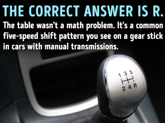 अनुमान लगाउनु भयो यो प्रश्नको उत्तर । छैन भने तलको फोटोमा हेर्नुहोस् । यसको उत्तर कुनै अंक नभई अंग्रेजी अल्फावेटको अक्षर ‘आर’ हो । किनकी प्रश्नमा एउटा कारको गेयरमा हुने छुटेको अक्षर खोजेको हो ।