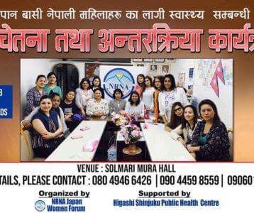 एनआरएनए महिला फोरम जापानले जापान सरकारको वडाकार्यलयहरुबाट गरिने स्वास्थ्य जाँच र सुबिधा बारे जानकारी तथा परिवार नियोजन र गर्भपतनबारे जापानको नियम कानुन कस्तो छ त रु भन्ने जानकारी गराउने उद्देश्येले एक विशेष कार्यक्रमको आयोजना गर्न लागेको बताईएको छ । कार्यक्रम आगमी जुलाई ८ तारिख आईतबार टोकियोको सिन्जुकु ह्याकुनिन च्यो २-२० -२३,स्थित सोलमारी मुरा हलमा, दिनको २ बजेदेखि साँझ ५ बजेसम्म हुनेछ ।