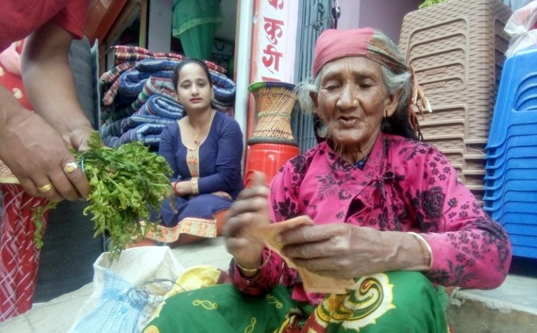 सबै दाँत झरेका, बुढ्यौलीले कुप्रिएको शरीर भए पनि उनको पिठ्यूँमा बोरा कहिल्यै टुट्दैन। कास्कीको अन्नपूर्ण गाउँपालिकाको घान्द्रुक घर भएकी ७५ वर्षीया मशान्ति बिकलाई सधैजसो कुस्माबजारका सडकमा भारी बोकेकै अवस्थामा भेटिन्छीन । उनी गाउँघरमा पाइने सागसब्जी, कन्दमुल खोजी गरी बोरामा लगाएर बजारमा बेच्न पुग्छिन्। त्यसबापत आएको पैसाले बिहान–बेलुकाको छाक टार्छिन्।