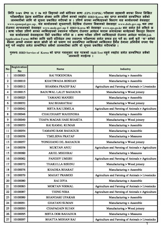 आगामी वर्ष सन् २०१९ को लागि लिइएको ईपीएस कोरियन भाषा परीक्षाको नतिजा प्रकाशित भएको छ । ईपीएस कोरिया शाखाले गत जेठ २६ र २७ गते लिएको परीक्षाको नतिजा प्रकाशित भएको हो । यस वर्ष कुल ७ हजार ९ सय ९६ जना परीक्षार्थी उर्त्तीण भएको इपीएस कोरिया शाखाले जनाएको छ । यस वर्ष कारियाले ७ हजार १ सय नेपाली कामदारको कोटा दिएको थियो । कोटाभन्दा झण्डै ९ सय बढी परीक्षार्थी उत्तीर्ण भएका छन् ।