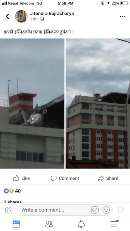 ग्राण्डी अस्पताल टोखा सडक काठमाडौंमा डाक्टर लिन गएको सिम्रिक एयरको हेलिकप्टर अवतरणको क्रममा दुर्घटनामा परेको छ । दिउँसो साढे २ बजे ग्राण्डीको छतमा रहेको हेलिप्याडमा अवतरण गर्दा हेलिकप्टर चिप्लिएर तल्लो छतमा खसेको छ ।