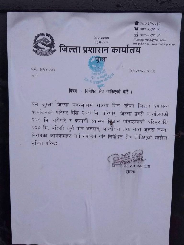 डा.केसी जुम्ला पुगे लगत्तै जिल्ला प्रशासन कार्यालय जुम्लाले अनसन र भेला निषेधित क्षेत्र घोषणा गर्दै सार्वजनिक सूचना जारी गरेको छ ।