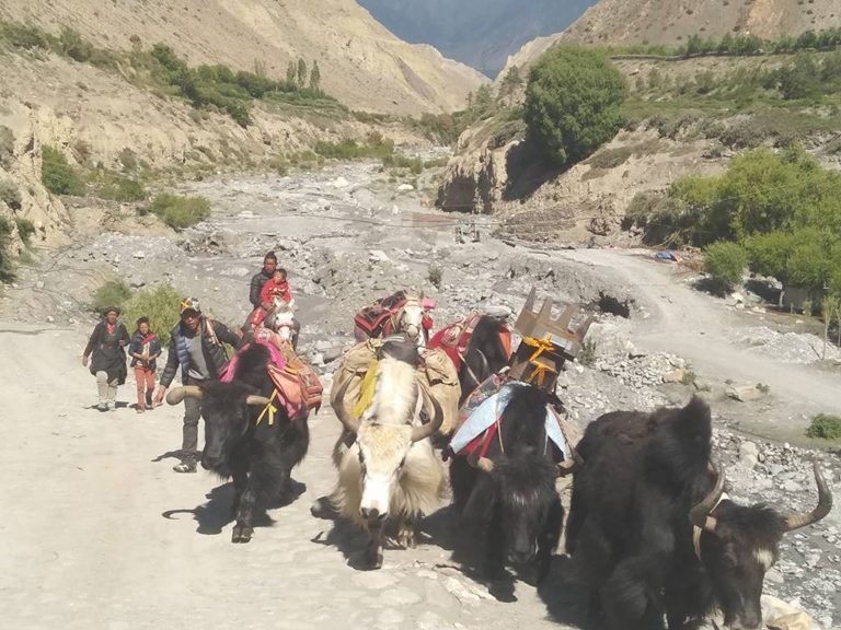 हिमालपारीको जिल्ला मुस्ताङको माथिल्लो क्षेत्रमा वर्षात्का लागि खाद्यान्न सामाग्रीसहित कागबेनीबाट चौंरीगाई लिएर जाँदै गरेका व्यापारीहरु । मुस्ताङका व्यापारीहरु हिउँदको समयमा जाडो छल्न बेंसी र गर्मीयाममा हिमाली जिल्ला डोल्पासम्म पुगेर आफ्नो पेशा तथा व्यापार गर्ने गर्दछन् ।