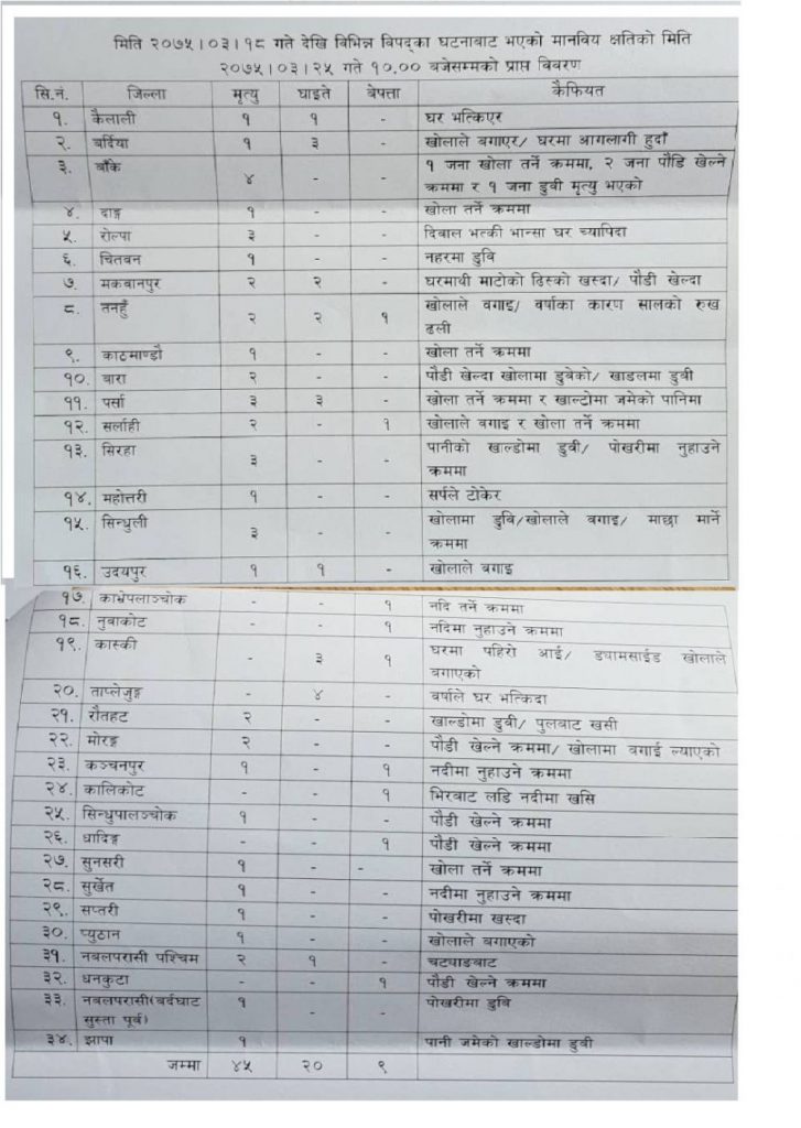 त्यसबाहेक वारपार गर्ने र नुहाउने क्रममा खोला, नदीमा बगेर र डुबेर मृत्यु हुनेको संख्या पनि बढी रहेको गृह मन्त्रालयले जनाएको छ ।