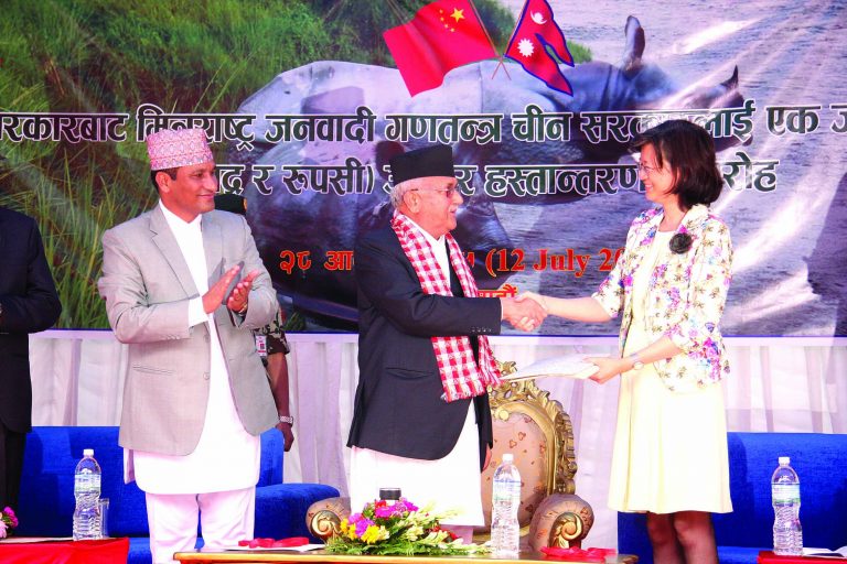 प्रधानमन्त्री ओलीको अघिल्लो कार्यकालमा चीनले नेपालसँग दुई जोडी गैंडा उपहार मागेपछि २०७३ असार २६ गतेको मन्त्री परिषद्को बैठकले चीनलाई गैंडा प्रदान गर्ने निर्णय गरेको थियो। अर्को जोडी अगामी दशैं अगावै चीनलाई हस्तान्तरण गर्ने गृहकार्य अघि बढाइएको वन्यजन्तु विभागले जनाएको छ। नेपालले यस अघि विभिन्न मुलुकलाई २६ जोडी गैंडा उपहार प्रदान गरिसकेको छ। भारत, अमेरिका, जापान, थाइल्यान्ड, अस्ट्रियालगायतका मुलुकमा दुर्लभजन्तु एक सिंगे गैडा पठाइएको छ।