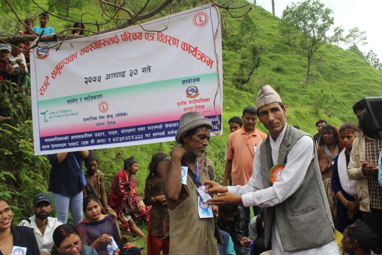 कर्णाली प्रदेशको सामाजिक विकास मन्त्रालयका सचिव गिरिजा शर्मा, गाउँ पालिकाका अध्यक्ष ओली र दैलेखका प्रमुख जिल्ला अधिकारी विश्वराज न्यौपानेले राउटे समुदायलाई बस्तीमै पुगेर परिचयपत्र वितरण गर्नु भएको हो ।