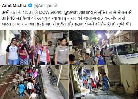 दिल्ली महिला आयोगले भारतको राजधानी नयाँ दिल्लीको मुनिरका क्षेत्रबाट १६ नेपाली युवतीको उद्धार गरेको छ।आयोगकी अध्यक्ष स्वाती मलिवालको नेतृत्वमा गएको टोलीले मंगलबार राति ती युवतीको उद्धार गरेको हो।