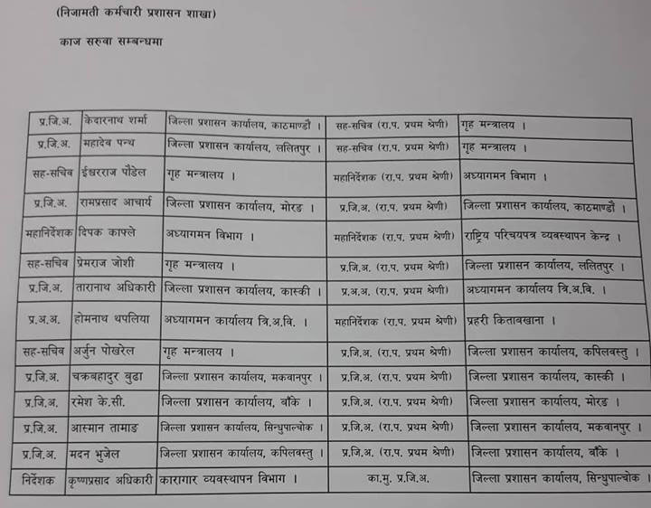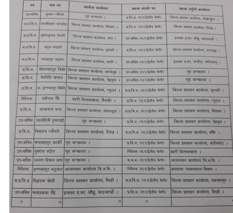 काठमाडौंको जिल्ला प्रशासन कार्यालयमा रामप्रसाद आचार्य र ललितपुरमा प्रेमराज जोशी आएका छन् । आचार्य जिल्ला प्रशासन कार्यालय मोरङमा थिए ।
