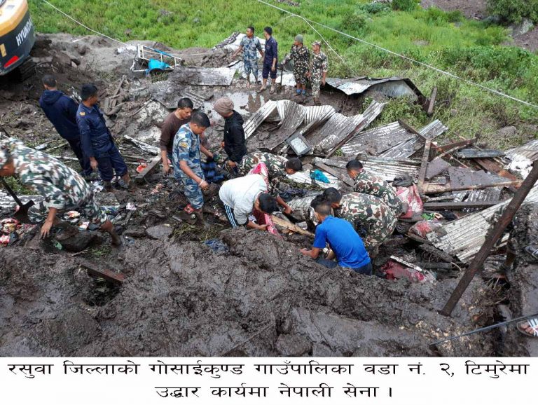 सालिकराम चालिसे, रसुवा । रसुवाको गोसाइकुण्ड गाउँपालिका–२, टिमुरेमा बुधबार राति गएको पहिरोमा परी ९ जनाको मृत्यु भएको छ । १२ जना अझै बेपत्ता रहेको जिल्ला प्रहरी कार्यलय रसुवाले जनाएको छ ।