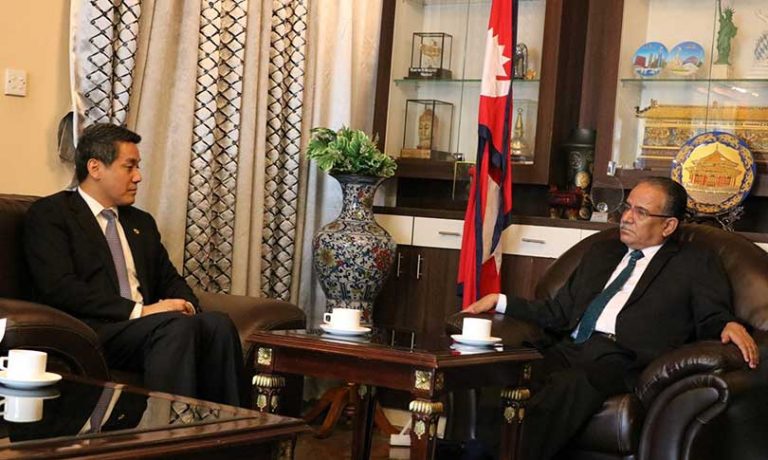 नेपाल कम्युनिष्ट पार्टी (नेकपा) का अध्यक्ष पुष्पकमल दाहाल ‘प्रचण्ड’ र नेपाल भ्रमणमा आएका चिनियाँ उपविदेश मन्त्री वाङ वाजुनबीच भेटवार्ता भएको छ । सोमबार बिहान प्रचण्ड निवास खुमलटारमा भएको भेटमा नेपालको आर्थिक समृद्धिमा चिनियाँ सहयोगबारे छलफल भएको प्रचण्डको सचिवालयले जनाएको छ ।