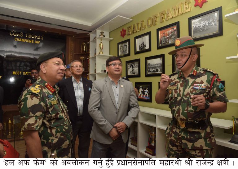 काठमाडौ (नेस) । प्रधानसेनापति राजेन्द्र क्षत्रीले लगनखेलस्थित सैनिक शारिरीक तालिम तथा खेलकुद केन्द्रको पहलमा नवनिर्मित ‘हल अफ फेम’ को उद्घाटन गर्नु भएको छ ।