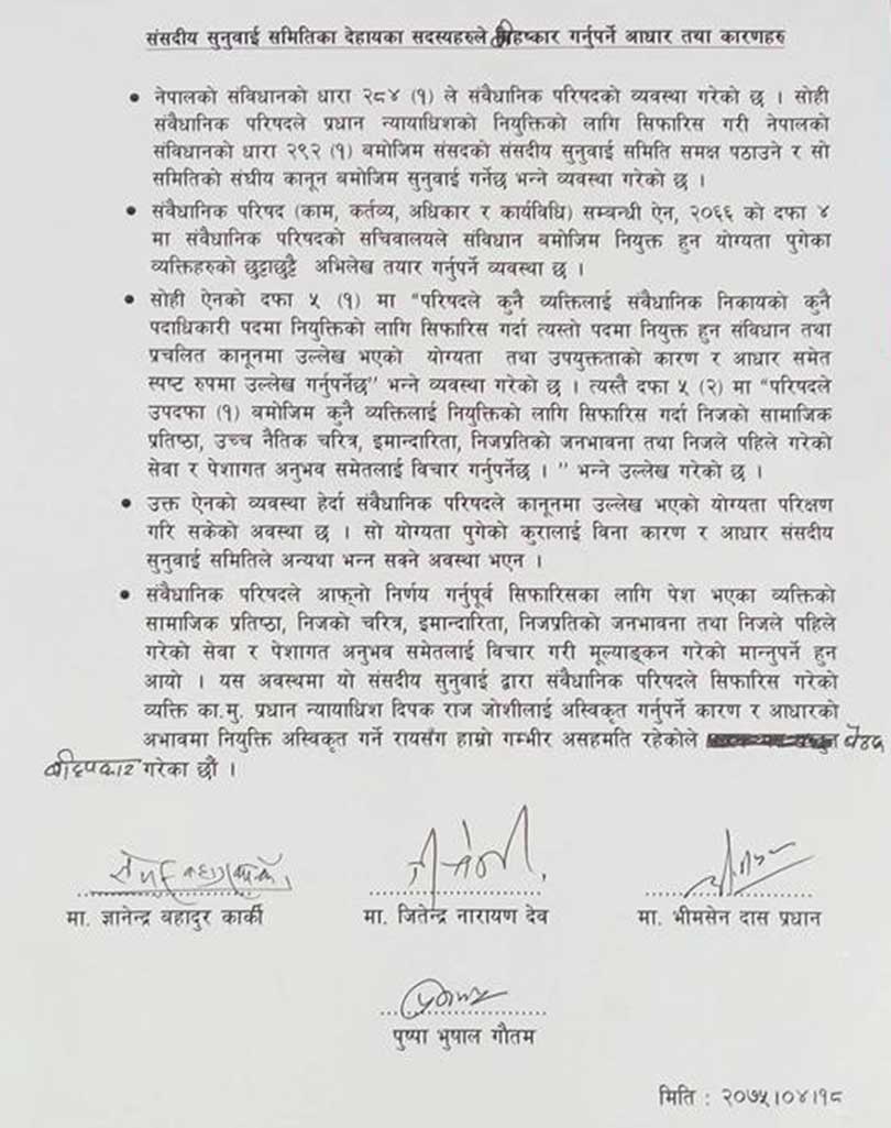 स्थगनपछि बसेको संसदीय सुनुवाइ विशेष समितिद्वारा प्रधानन्यायाधीशमा प्रस्तावित दीपकराज जोशी अस्वीकृत भएका छन्।