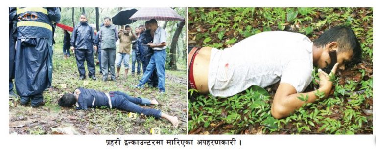 अपराध महाशाखाको टोलीसँगको भिडन्तमा भक्तपुरकै सुर्यबिनायक मन्दिरमाथि रहेको जङ्गलमा सोमबार दिउँसो अपहरणकारीसँग भिडन्त भएको थियो । अपहरणकारी खोज्दै गएको महाशाखाको टोलीमाथि उनीहरुले गोली प्रहार गरेपछि प्रहरीले जवाफी फायर गर्दा २ जना अपहरणकारी मारिएको महागरीय प्रहरी परिसर भक्तपुरका प्रमुख प्रहरी उपरीक्षक हिमालयकुमार श्रेष्ठले जानकारी दिनुभयो ।