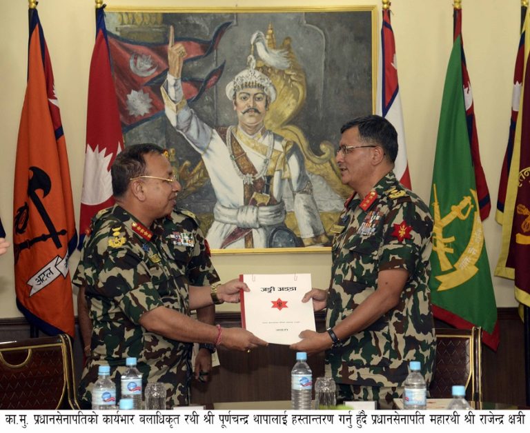 प्रधानसेनापति क्षत्रीले बिहीबार नै एक कार्यक्रमको आयोजना गरेर प्रधानसेनापतिको जिम्मेवारी थापालाई हस्तानतरण गर्नु भएको छ । यस अघि नै बसेको मन्त्रिपरिषदको बैठकले भदौ २४ अर्थात बिहीबारबाट कामु प्रधानसेनापतिको जिम्मेवारी थापालाई दिने निर्णय गरेको थियो ।
